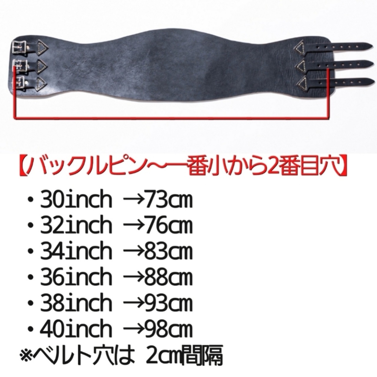 キドニーベルトは本体の先端同士を数cm重ねて締める為、本体の全長ではなくベルト穴を参考にしてください。